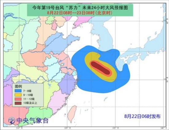 大风预报:22日08时至23日08时,江苏南部沿海、浙江北部沿海、黄海南部、东海北部和南部的偏北海域将有7-10级大风,东海北部的部分海域风力可达11-12级,“苏力”中心经过的附近海域风力可达13-15级,阵风16级。