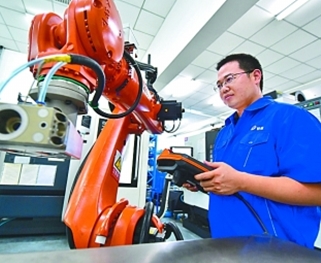 河北廊坊一家公司的工作人员在操作机器人。新华社发