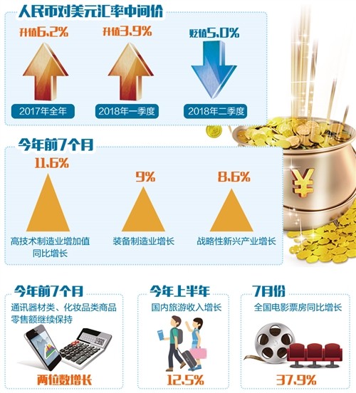 从供给方面来看,我国供给结构在持续优化。数据显示,前7个月,高技术制造业增加值同比增长11.6%,装备制造业增长9%,战略性新兴产业增长8.6%。从消费方面来看,消费升级态势继续,前7个月通信器材类、化妆品类商品零售额继续保持两位数增长,上半年国内旅游收入同比增长12.5%,7月份全国电影票房同比增长37.9%。从投资方面来看,投资结构在优化,制造业投资增速连续4个月保持回升,民间投资增速连续两个月小幅回升。这些基本面的积极迹象对人民币汇率构成了正向支撑。