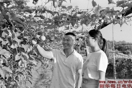 武平县返乡创业大学生王秀珍(右)与合作种植的果农一起查看百香果的生长情况。(本报记者郭圻摄)