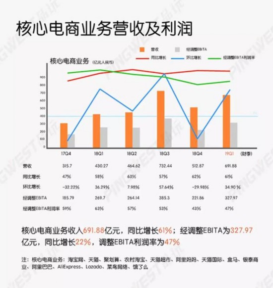 经调整EBITA(息税摊销前利润)为265.02亿元,核心电商业务经调整EBITA为327.97亿元,同比增长22%,超出分析师预期。核心电商调整后EBITA利润率为47%,不计菜鸟网络和饿了么的并表(2018年5月中),以及对新零售业务和Lazada的投资,核心电商业务的经调整EBITA利润率同比保持稳定。