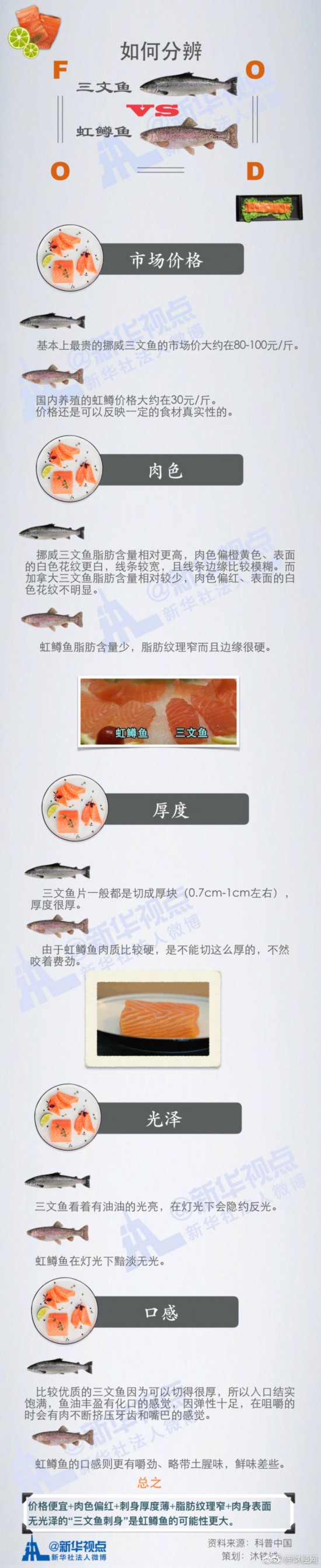 @新华视点发布微博教大家如何分辨三文鱼和虹鳟鱼,而此前中国水产流通与加工协会发布《生食三文鱼》团体标准,其中虹鳟鱼被归入三文鱼,引发争议。
