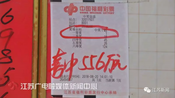 结果,当晚九点开奖后,这张彩票喜中一注一等奖,还中出了18注三等奖、46注四等奖、20注五等奖,总计获得奖金556万元。