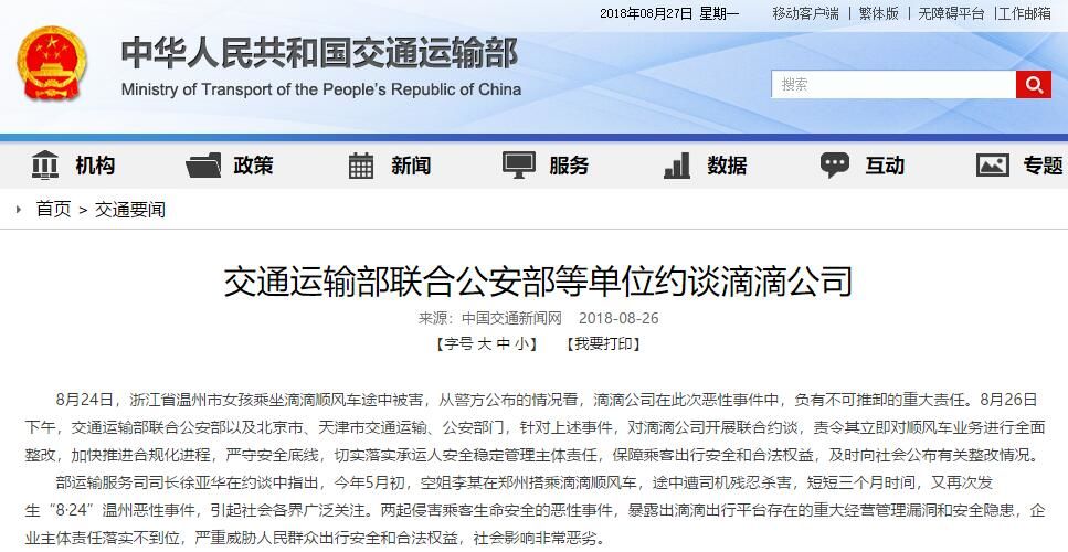 据了解,日前,交通运输部联合公安部等单位已约谈滴滴公司,指出滴滴公司在此次恶性事件中,负有不可推卸的重大责任,社会影响非常恶劣,责令全面整改,限期公布方案,接受社会监督。