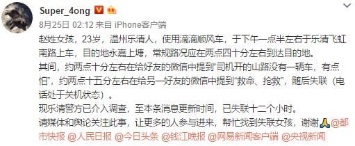8月25日凌晨,一则“乐清赵姓女孩使用滴滴顺风车后发出求救信息并失联”的微博开始在网络上热传。据网友@Super_4ong,她的朋友于24日乘坐滴滴顺风车后失联,请求网友帮忙寻人。凌晨4时许,犯罪嫌疑人、滴滴顺风车司机钟某被警方抓获,失踪女子随后被证实遇害。事后,遇难者朋友发文质疑滴滴在救援过程中的表现,认为对方机械般的回复严重的贻误了侦查和抢救的时机,迅速引爆了舆论。