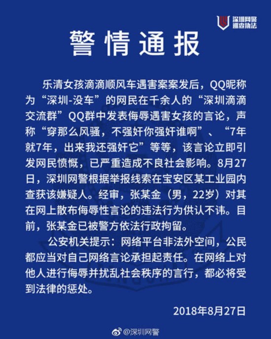 @深圳网警 8月27日消息,乐清女孩滴滴顺风车遇害案案发后,QQ昵称为“深圳-没车”的网民在千余人的“深圳滴滴交流群”QQ群中发表侮辱遇害女孩的言论,随即引发网民愤慨,已严重造成不良社会影响。8月27日,@深圳网警 根据举报线索在宝安区某工业园内查获该嫌疑人。经审,张某金(男,22岁)对其在网上散布侮辱性言论的违法行为供认不讳。目前,张某金已被警方依法行政拘留。公安机关提示:网络平台非法外空间,公民都应当对自己网络言论承担起责任。在网络上对他人进行侮辱并扰乱社会秩序的言行,都必将受到法律的惩处。