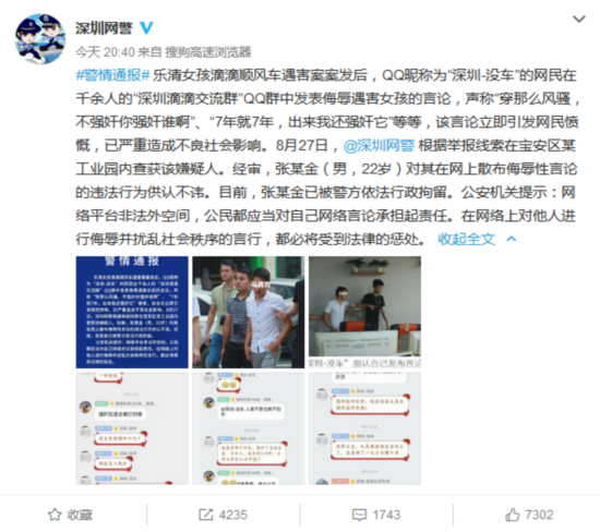 新浪科技讯 8月27日晚间消息,深圳市公安局公共信息网络安全监察分局官方微博@深圳网警 发布警情通报称,乐清女孩滴滴顺风车遇害案案发后,QQ昵称为“深圳-没车”的网民在千余人的“深圳滴滴交流群”QQ群中发表侮辱遇害女孩的言论,随即引发网民愤慨,已严重造成不良社会影响。