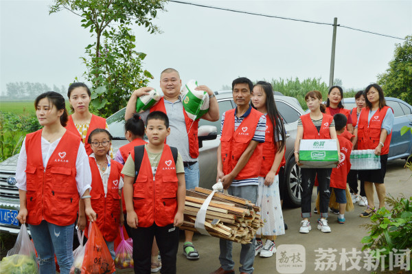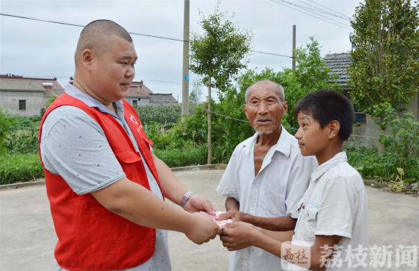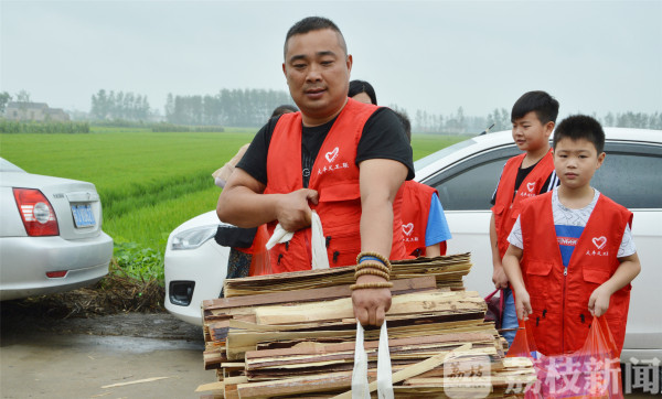 8月26日上午,开学前夕,盐城市大丰区部分家长和孩子们在大丰义工联吴兰、郭前程的带领下一起冒雨来到盐城市大丰区大中镇老坝村,曾经共同学习生活近一个月的同学朱峰家。朱峰长期生活在农村,和85岁的爷爷相依为命。朱峰的父亲六年前喝农药自杀,妈妈智力低下生活不能完全自理。家里仅靠爷爷种着8亩地,为了从土地里挣出一家人的生活费,爷爷只好起早贪黑的去干活,这样的生活,已经持续了多年。