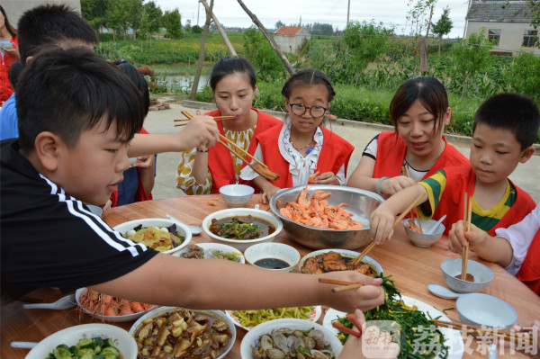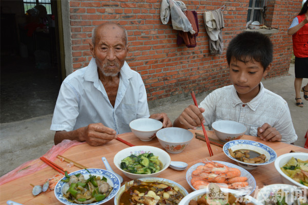 在大家的共同努力下,一个多小时的时间,十多个美味的菜肴就摆放在桌子上,朱峰搀着爷爷,孩子们拉着自己的家长。吃饭过程中,孩子们一直主动帮家长夹菜盛饭,吃完饭后也争抢着收拾碗筷。