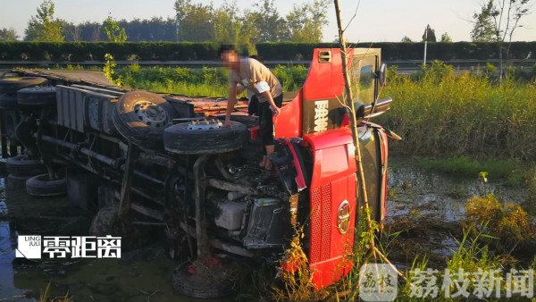 监控显示,一辆红色大货车在行驶至连霍高速八义集出口匝道时,突然冲破高速公路护栏,冲进了路旁的河沟内。民警到达现场后发现, 有十多节护栏被撞倒,车辆侧翻,所幸河沟内的水并不深,车上两名驾乘人员也只是有一点擦伤,自己爬出了驾驶室。驾驶员周某说,他迷迷糊糊的就把车开入了沟里,自己也不知道怎么回事。