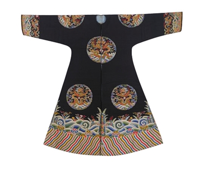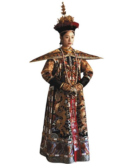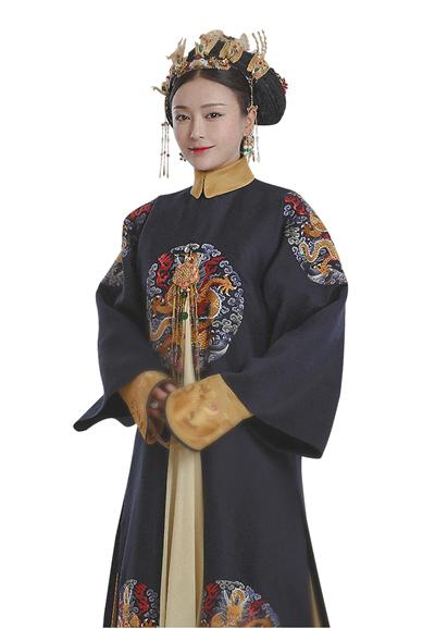 据故宫博物院馆藏记载,皇后吉服有吉服冠、龙褂、龙袍、吉服朝珠等,一般节日时穿用。据《钦定大清会典》载:皇太后、皇后龙褂“色用石青,绣文五爪金龙八团,两肩前后正龙各一,襟行龙四,下幅八宝立水,袖端行龙各二。”在《延禧攻略》和《如懿传》中皇后、皇太后在祝寿、宴赐等重要场合都有穿类似的石青色吉服。