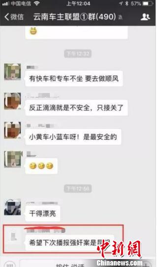 中新网昆明8月28日电 (缪超)昆明市公安局28日晚发布消息,昆明网警巡查发现有4名网民在近500人的“云南车主联盟①群”微信群内,就浙江温州女孩乘坐滴滴顺风车遇害案件发表侮辱性言论,内容低俗、不堪入目,引起广大网民的强烈愤慨,造成不良社会影响,公安机关发现线索后立即开展调查工作。