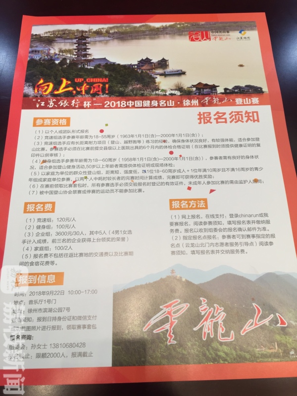 本次徐州云龙山登山赛赛事规模约2000人,设男/女竞速组、健身组两组竞赛。比赛线路由滨湖公园音乐厅广场起步,经湖中路、湖南路至云龙山百花广场,从云龙山九节山上山后到达终点云龙山西门,全程约8公里。举办全国性的登山赛,有助于推动全民健身活动的开展,形成徐州“春有马拉松、秋有登山赛”的活动品牌。目前,报名工作已经全面开展,可以通过“我要赛”和“中国跑”两个网站报名,线下报名点为云龙山北门志愿者服务岗亭。