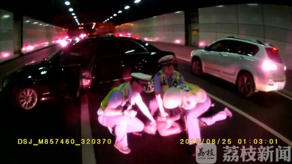 8月25日凌晨1点02分,南京交警五大队执勤五中队民警在江东北路设卡对过往车辆逐一进行酒驾检查时,发现前方一辆黑色奔驰小车行驶异常缓慢,于是上前查看。谁知当交警靠近时,该车突然掉头,企图逆行逃跑,无奈被周围的车辆阻断了去路。