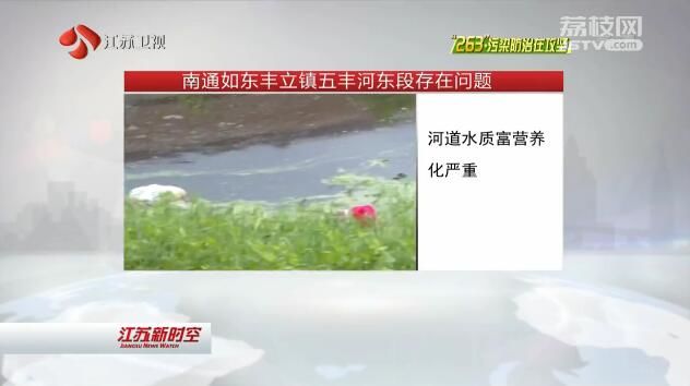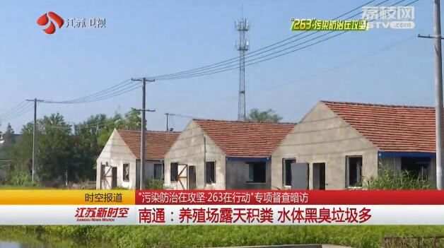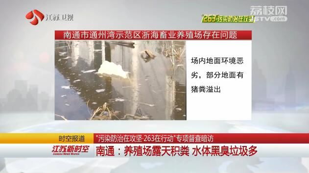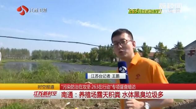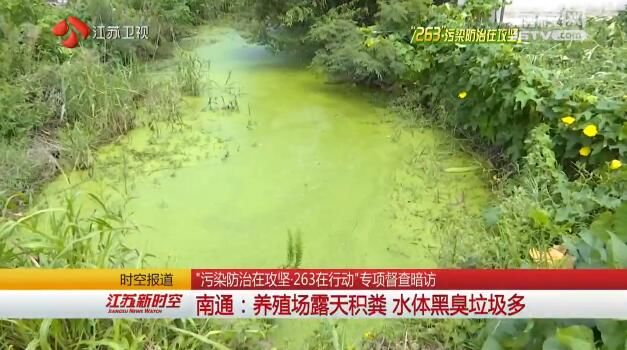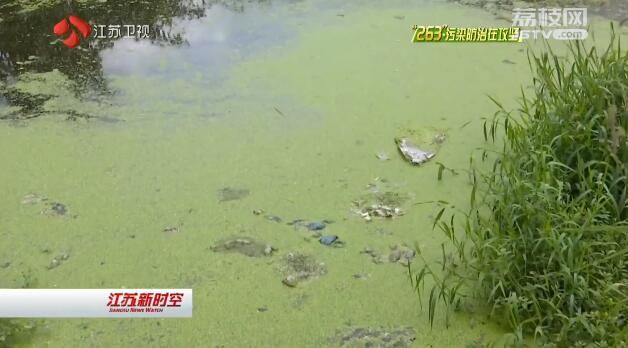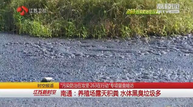 江苏台记者王鹏:“走进养猪场,如果单看路的一侧,这是一个非常标准的养猪场,但是大家看我的身后,现在是有一个河道,已经被大量的猪粪所填满,散发出阵阵的恶臭。”