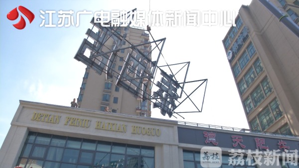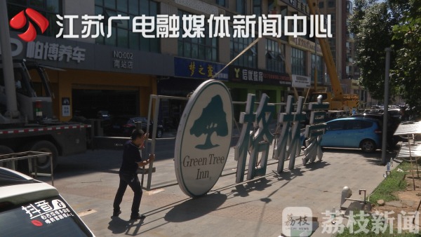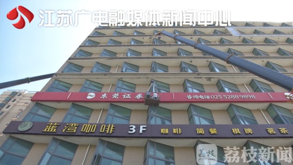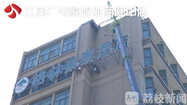 位于南京市玉兰路19号的这家格林豪泰酒店,上下左右总共安装了4块广告牌,除了进门处的两处店招之外,另外两处悬挂在大楼南北两侧40米左右的高空。因为面积巨大,存在一定的安全隐患。且据城管部门前期调查发现,如此巨大的广告招牌前期并没有办理相关手续。