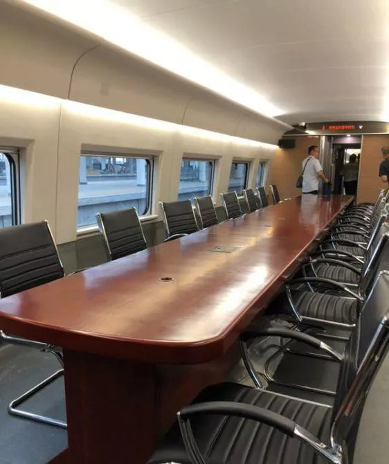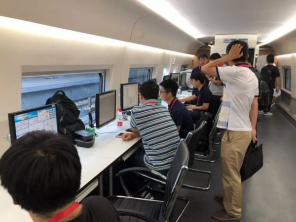 在动车综合检测列车车厢内,工作人员正在调试设备,为发车做准备。