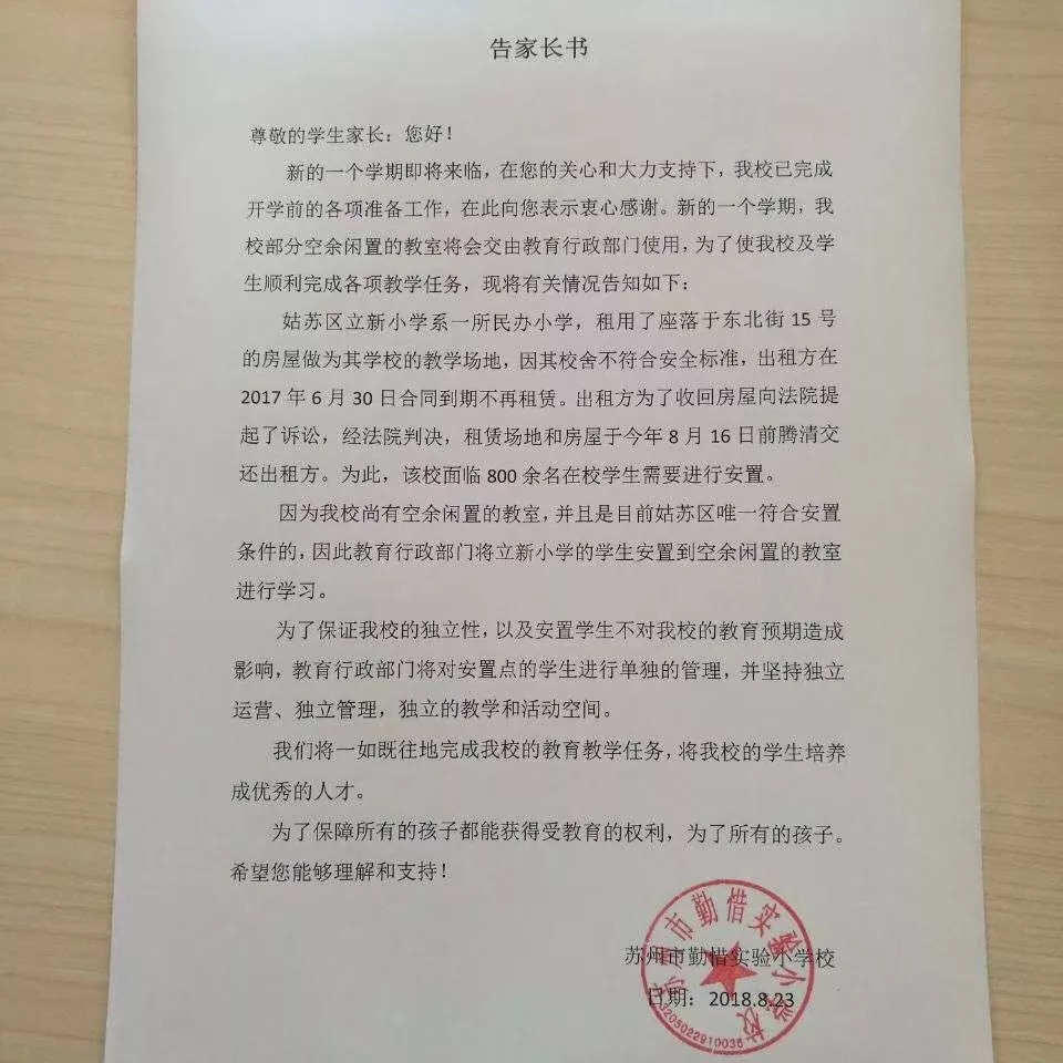 8月23日,勤惜实验小学校发布了一份《告家长书》,称“我校尚有空余闲置的教室,并且是目前姑苏区唯一符合安置条件的……教育行政部门将对安置点的学生进行单独的管理,并坚持独立运营、独立管理,独立的教学和活动空间”。
