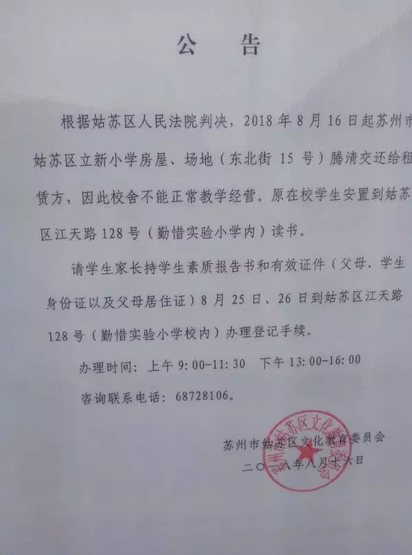 一份落款为苏州市姑苏区文化教育委员会2018年8月16日的公告,张贴在立新小学旧址门口, “(立新小学)校舍不能正常教学经营,原在校学生安置到勤惜实验小学内读书”。通知同时短信发给立新小学部分家长。