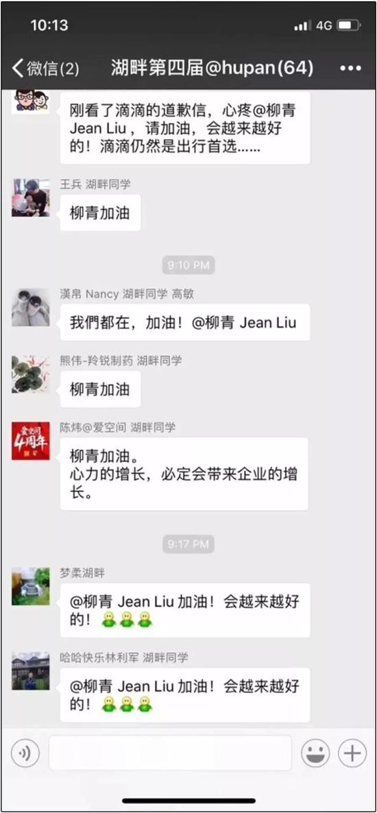 客观的说,湖畔大学微信群中的学员纷纷鼓励滴滴总裁柳青,喊出“心疼柳青”、“加油柳青”之类的话,并不等于他们一定是为滴滴顺风车遭到大众批评和无限期下线表达不满。因为按照我们中国人的为人处世原则和手段来说,“加油柳青”、“心疼柳青”很可能只是这些人的一句客套话,没有实质性含义。毕竟同在一个圈子里混,谁都不太可能选择在这个时候当面公开批评滴滴以及柳青,那样只会被别人贴上“落井下石”的标签。相反,在商业圈之中,“雪中送炭”才能有最大的收获,一句“心疼柳青”则是最廉价的“雪中送炭”方式。