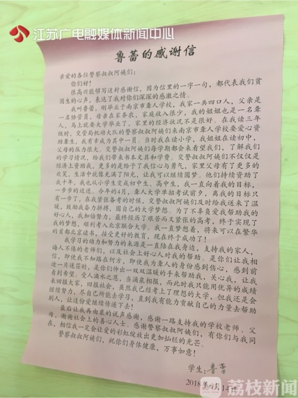 这个暑假,鲁蕾收到了北京联合大学的录取通知书,今天,她带着这个好消息来到南京交警机动大队,希望能和叔叔阿姨们,分享这份喜悦。“我考上大学,要好好学习,好好工作,减轻父母的压力!”