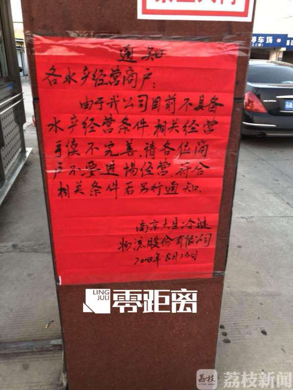 近日,有市民反映,在南京六合区的大生冷链公司门前贴着一张奇怪的告示:让经营户们不要进场经营。