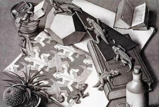 在艺术家M.CEscher的画中,二维的蜥蜴正试图变为三维实体,逃出画面