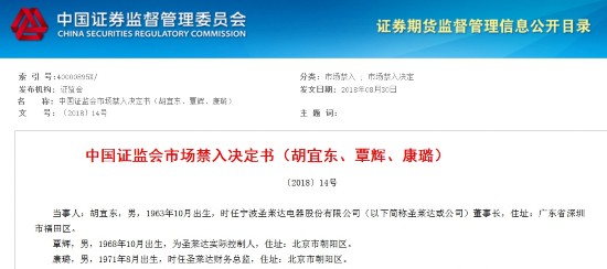 中新经纬客户端9月5日电 9月5日,中国证监会网站披露一则市场禁入决定书(〔2018〕14号),决定书显示,证监会依法决定对宁波圣莱达电器股份有限公司董事长胡宜东、实际控制人覃辉、财务总监康璐分别实施10年、5年和3年的实施市场禁入措施。证监会认定,上述人员通过虚构影视版权转让业务和虚构财政补助,虚增公司收入和利润。