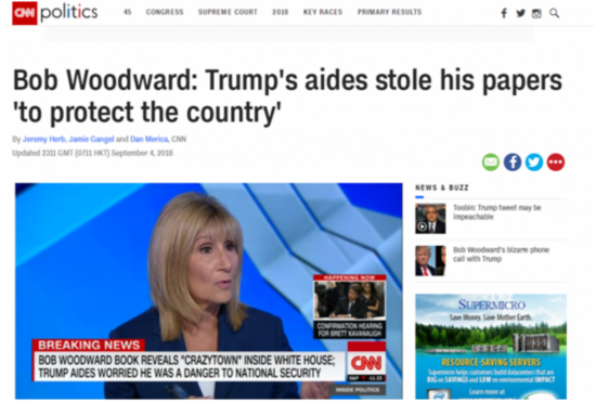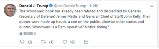 “伍德沃德的书已经被国防部长詹姆斯·马蒂斯及白宫幕僚长约翰·凯利驳斥了,是不可信的。这些引述的话都是骗人的,完全是在欺诈民众。其他故事及引述的内容也一样。伍德沃德是民主党的密探吗?在寻找时机?”