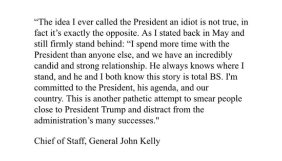 “那些有关我曾称总统是白痴的消息不是真的,事实上,我的说法恰恰相反。5月份我就已经回应过,我坚定认为,我和总统在一起的时间比任何人都长,我们之间存在一种坦诚互信且强大的关系。他总能知道我是何种立场,他和我都知道,那些故事根本就是胡扯。我坚定地效忠于总统、总统的议程以及我们的国家。试图诽谤总统身边的人,分散政府所获得成功的行为是很可悲的。