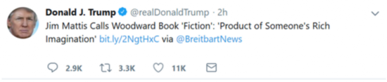 就在两个小时前,特朗普干脆直接引用国防部长马蒂斯的话,将这本书称作“小说”:某人丰富想象力的产物。