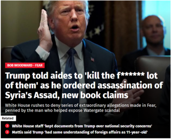 更令人震惊的,是书中描述的一件事——去年美国认为“叙利亚政府对平民使用化学武器”后,特朗普告诉马蒂斯去暗杀叙总统阿萨德。马蒂斯当时回应说他会“立即着手办此事”,但后来制定了一个不危及阿萨德人身安全的有限空袭方案。