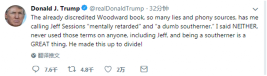 “已经不可信的伍德沃德的书,如此多谎言和虚假的消息来源说我叫杰夫·塞申斯是‘弱智’、‘一个愚蠢的南方人’。我从没说过,从来没有在任何人身上使用过这些词,包括杰夫。并且,作为一个南方人是一件很好的事。他捏造了这个分歧!”