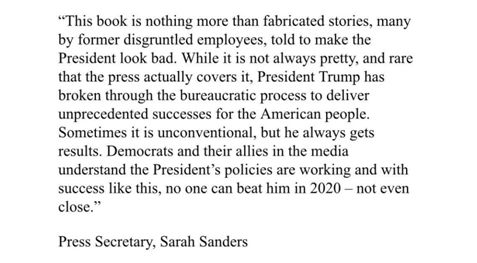 “这本书不过是捏造的,许多内容都是由以前心怀不满的员工所写,想抹黑总统。尽管媒体的报道不总是那么好,不总是按照事实去报道,但特朗普总统突破了官僚程序,给美国人民带来了前所未有的成功。