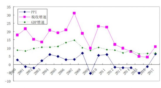 从这张图也可以看出,2000-2017年间,凡是PPI增长速度为正时,也就是生产资料价格上涨时,税收增速就会远超GDP增速;反过来,凡是PPP呈现负增长时,税收增速就会快速向GDP增速靠近,甚至会跌到GDP增速以下。