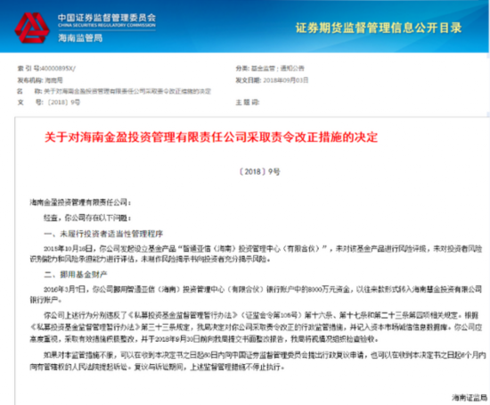 9月3日,海南证监局对海南金盈投资管理有限责任公司(以下简称海南金盈)做出采取责令改正措施的决定,这一监管措施出台一是因为该公司未履行投资者适当性管理程序,2015年10月16日,该公司发起设立基金产品“智通亚信(海南)投资管理中心(有限合伙)”,未对该基金产品进行风险评级,未对投资者风险识别能力和风险承担能力进行评估,未制作风险揭示书向投资者充分揭示风险。