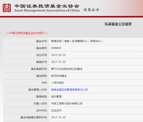 火山君进一步查询发现,海南金盈目前在基金业协会备案有一只产品,即智通亚信(海南)投资管理中心(有限合伙),备案时间为2017年11月10日,基金类型为股权投资基金。