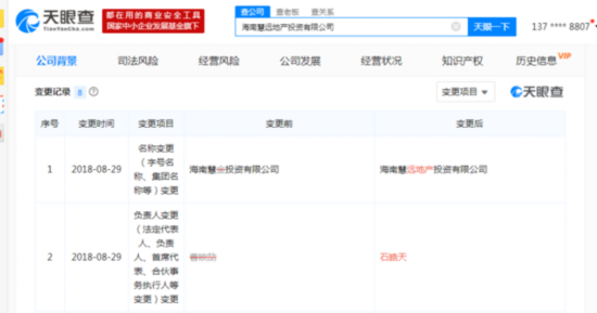火山君从天眼查信息上看到,海南慧金投资有限公司在2018年8月29日进行了变更,变更后的名字为海南慧远地产投资有限公司,同时公司法定代表人也由曹欧劼变更为石皓天。