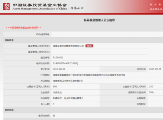 那么,挪用这8000万元巨额基金财产的海南金盈又是何方神圣?火山君在基金业协会的官网上进行了查找,发现该公司于2017年8月7日在基金业协会登记备案,机构类型为私募股权、创业投资基金。