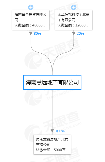 天眼查的信息进一步显示,海南慧金投资有限公司持有海南慧远地产有限公司80%的股权,而海南慧远地产有限公司的法定代表人为曹欧劼,公司住址为海南省海口市秀英区美林路8号慧远·美林谷综合服务楼105号。
