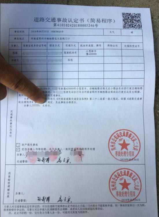 9月6日下午4点多钟,在郑州市公安局交警二大队事故处理室,民警将劳斯莱斯司机陈某和电动车主郑某的父亲,叫到一起介绍事故处理情况。民警称,这起事故不大,依照法律规定,符合走简易程序处置,并对双方下达了事故认定书。