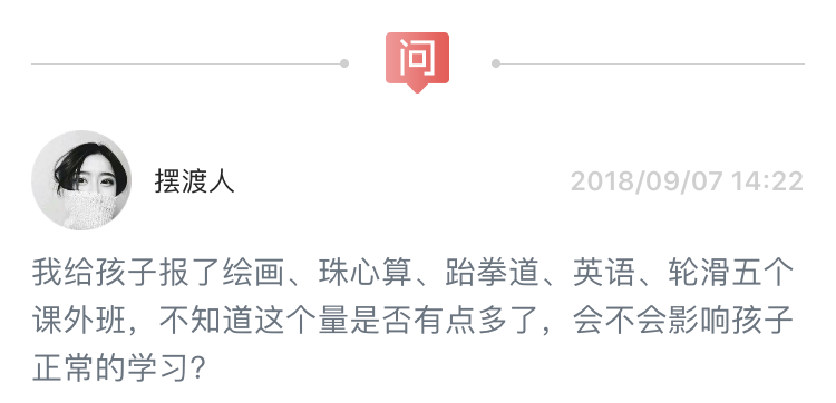孩子参加课外学习是有好处的,但我认为出发点是家长要掌握好报课外班的初衷:是想让孩子学还是孩子对这个事情有自己的想法?是家长针对孩子具体的问题去报班?还是说人家报什么我报什么,不考虑孩子自己的想法?