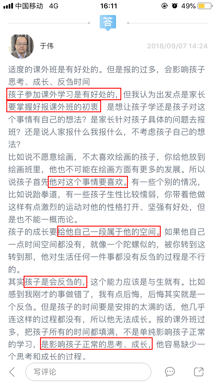 所以,兴趣是孩子的兴趣,不是家长的兴趣,也不是别人的兴趣,更不是上学需要的兴趣。相信看了于伟校长的观点,更多妈妈们会做出适合自己孩子的选择。