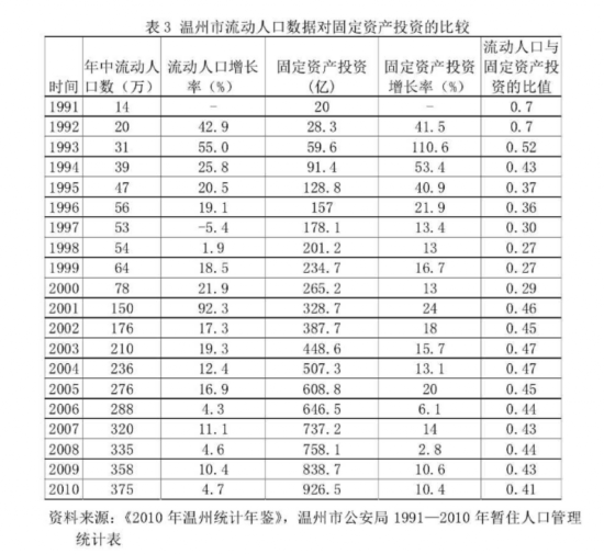 根据姜春芽(2014)的研究,温州市流动人口对固定资产投资的影响,基本上是随着流动人口数量增长而增长;而在人口流动人口减少的年份,固定资产投资增量也趋缓。