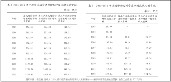 李庄园(2017)的研究认为,2012年与2003年相比,总流动劳动力对宁波市GDP的贡献增加了8倍,对财政收入的贡献也增加了将近8倍。由于第二产业比第三产业能吸纳更多的流动劳动力就业,且第二产业流动劳动力对宁波市财政收入的贡献也超过第三产业,可见,流动劳动力的规模仍然是影响其所在产业对财政收入的贡献大小的重要因素。