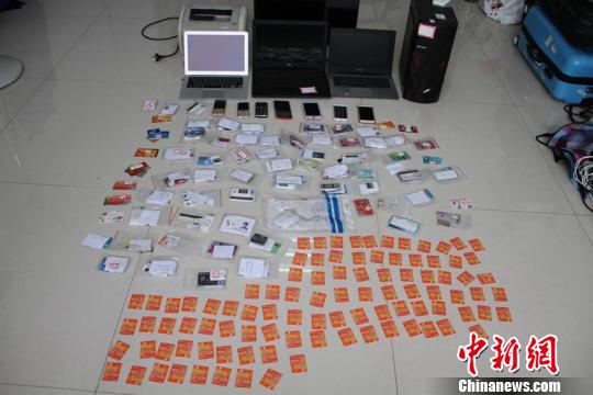 房间内,多台电脑屏幕滚动刷新着收付款信息,几百张银行卡和电话卡平铺在地上。