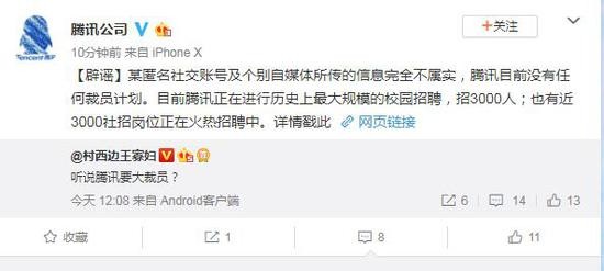原标题:腾讯:裁员消息不实,3000名额的校园招聘正在进行