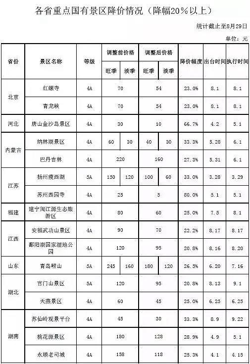 据介绍,在上述314个景区中,5A级景区有121个、4A级景区有155个。按降价幅度统计,实行免费开放的景区有30个、降幅在30%(含30%)以上的有29个、降幅在20%(含20%)~30%的有48个。