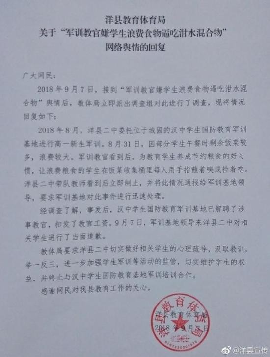 汉中市洋县县委宣传部官方微博@洋县宣传9月7日消息,洋县教育体育局关于“军训教官嫌学生浪费食物逼吃泔水混合物”网络舆情的回复: