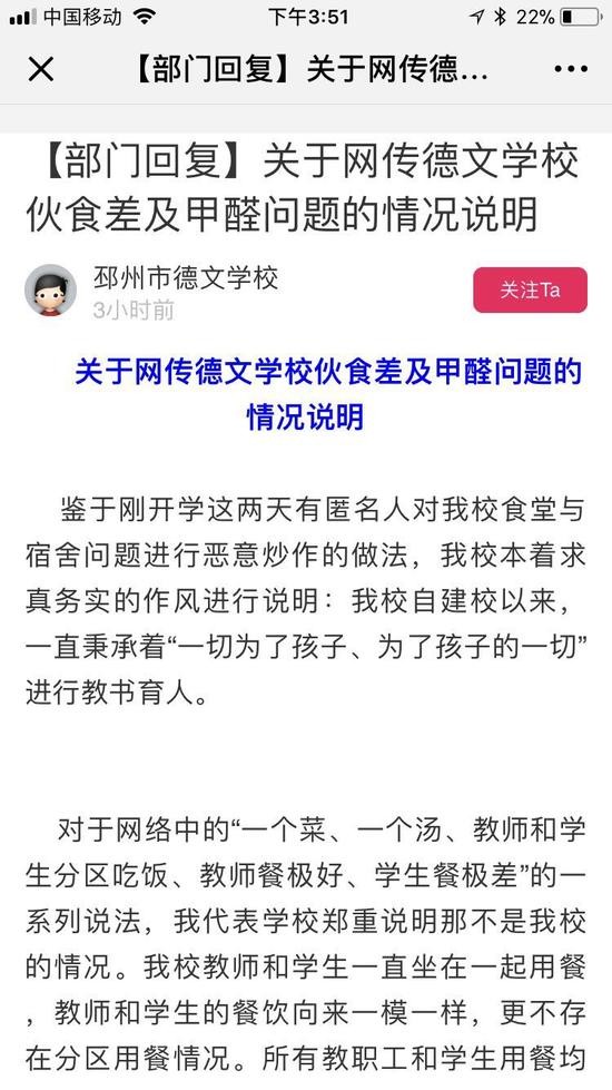 对于上述网传视频,9月7日下午1点左右,邳州市德文学校通过实名认证账号,在邳州当地的“邳州论坛”、“邳州信息网”等网站发布了一份“情况说明”,称“那不是我校的情况”。该校称,学校教师和学生一直坐在一起用餐,“教师和学生的餐饮向来一模一样”,也不存在分区用餐的情况。